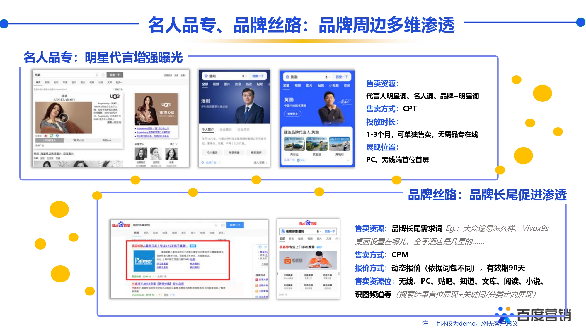 百度搜索品牌广告新的打开方式,面向品牌客户的CPM广告产品,预算更灵活,资源更丰富,全面覆盖百度6类场景和27个产品(含搜索首位)。
