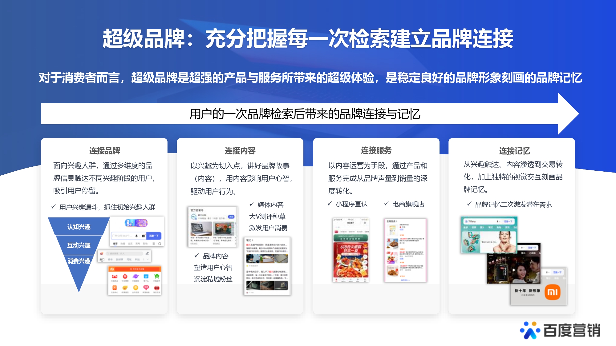 品牌推广基于百度搜索引擎,通过品牌词触发,提供全场景一站式品牌营销服务阵地,以创新的样式和视觉交互吸引品牌认知阶段的搜索用户,加深用户对客户品牌的第一印象,进而引导用户形成对品牌的好感和忠诚度。