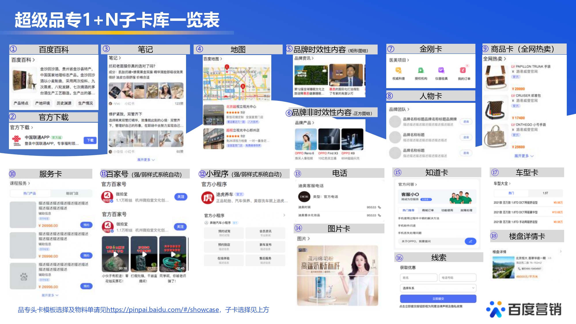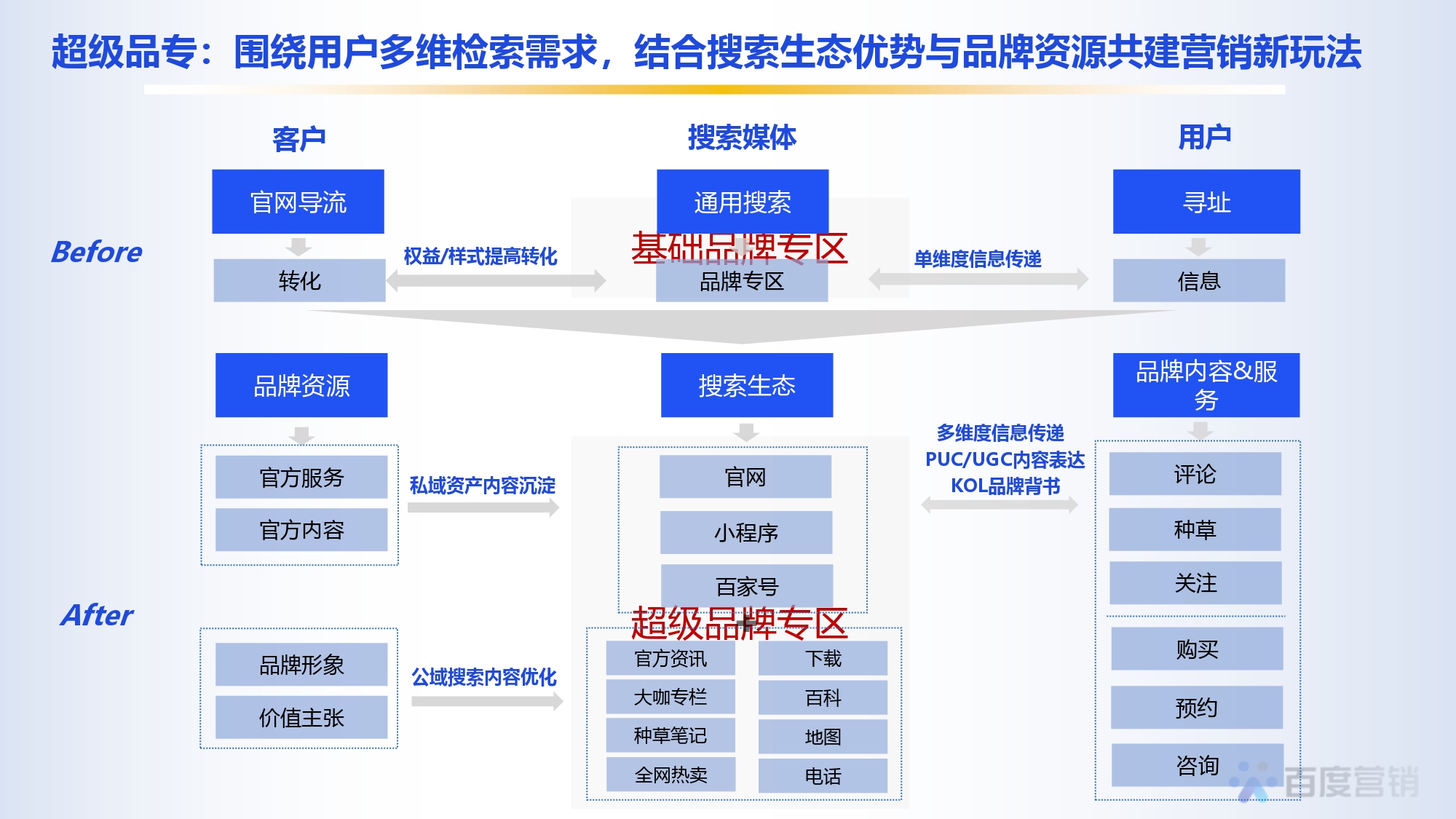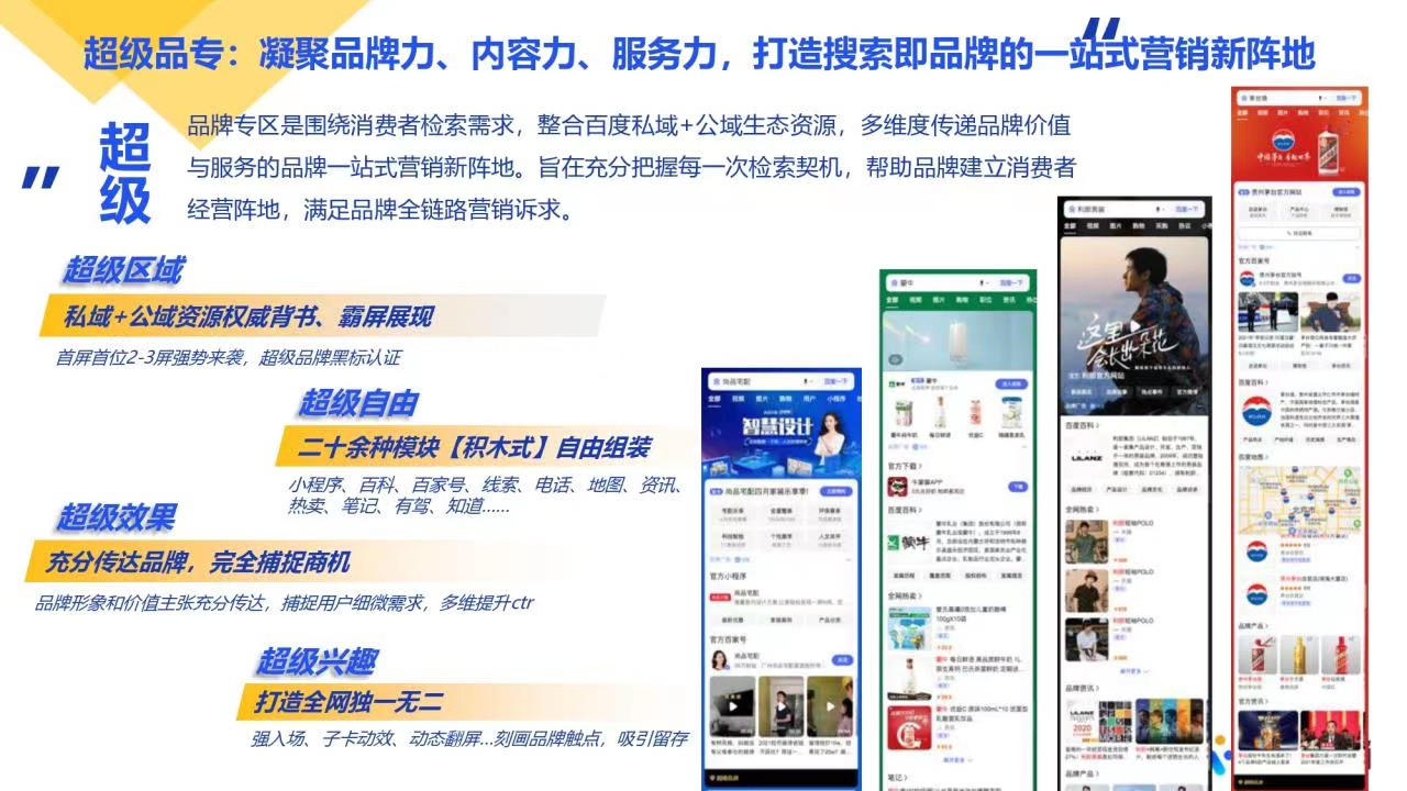 超级品专是在品牌专区基础上推出的升级型广告样式,结合了百家号、小程序、视频等其它百度系私域流量资源,将企业的品牌信息、资讯等内容展示在用户面前,沉淀品牌的忠实用户,提升企业品牌推广效能。